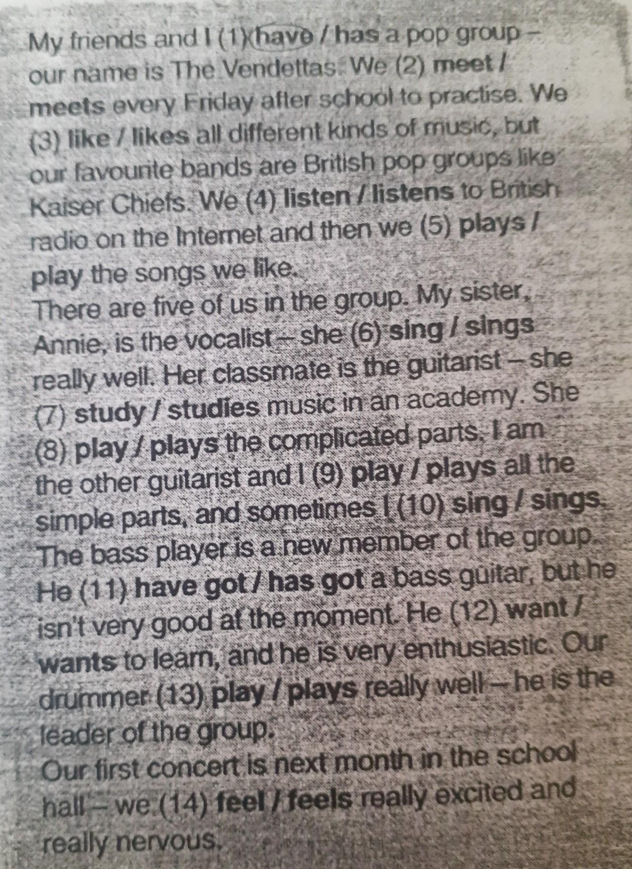 Have;meet;like;listen;play;sings;studies;play;sing;has got;wants;plays;feel