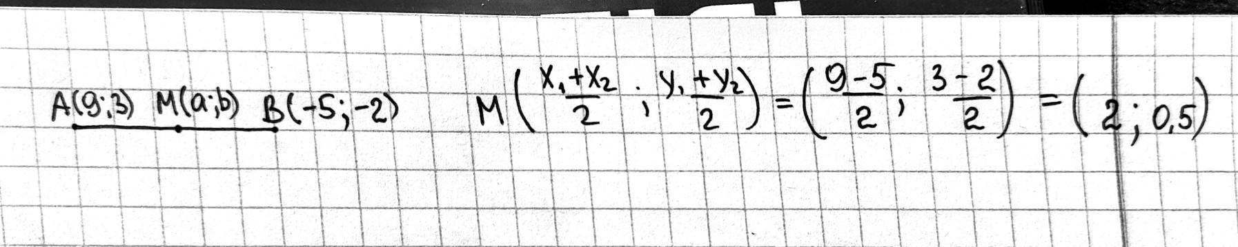 Назови координаты точки M — середины отрезка AB, если известны координаты точек A(9; 3) и B(−5; −2).
