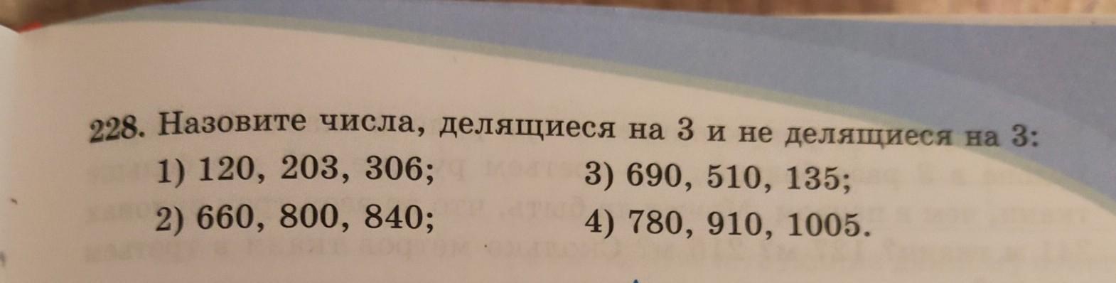 228. Назовите числа, делящиеся на 3 и не делящиеся на 3: 1) 120, 203, 306; 3) 690, 510, 135; 2) 660, 800, 840; 4) 780, 910,1005