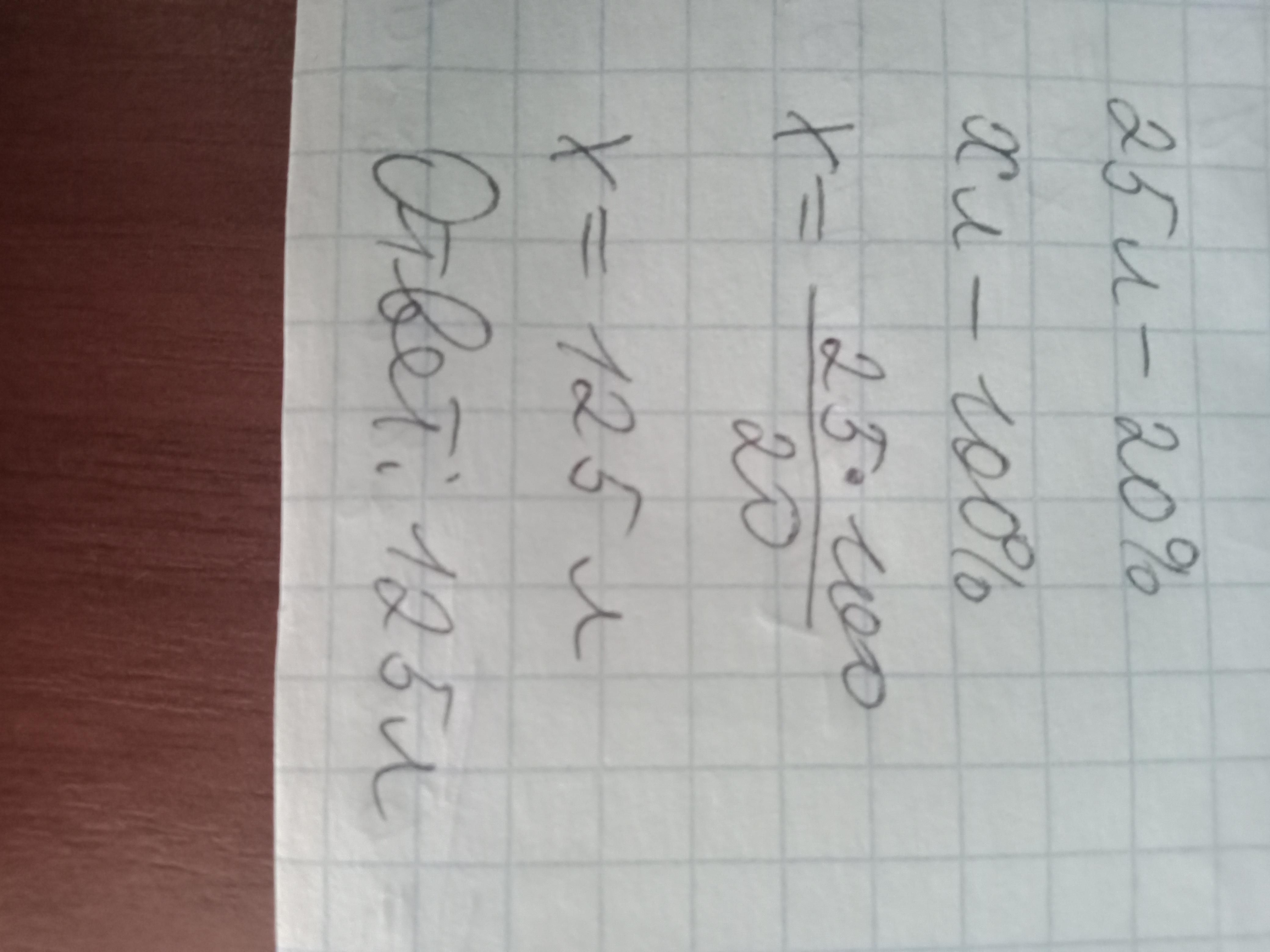 Составить пропорцию.В бак залили 25 литров воды что составило 20% его объёма. Какова вместимость бака?