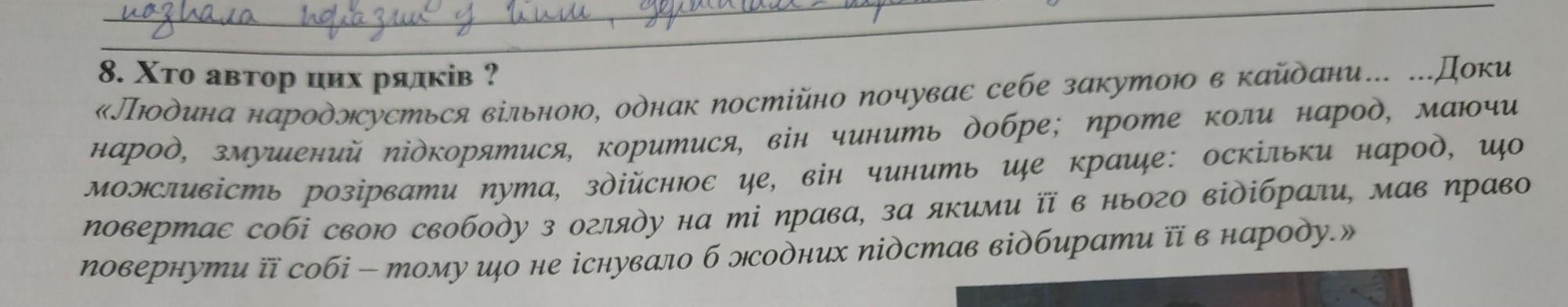«Людина народжується вільною, однак постійно почуває себе закутою в кайдани……Доки народ, змушений підкорятися, коритися, він чинить добре; проте коли народ, маючи можливість розірвати пута, здійснює це, він чинить ще краще: оскільки народ, що повертає собі свою свободу з огляду на ті права, за якими її в нього відібрали, мав право повернути її собі – тому що не існувало б жодних підстав відбирати її в народу.»