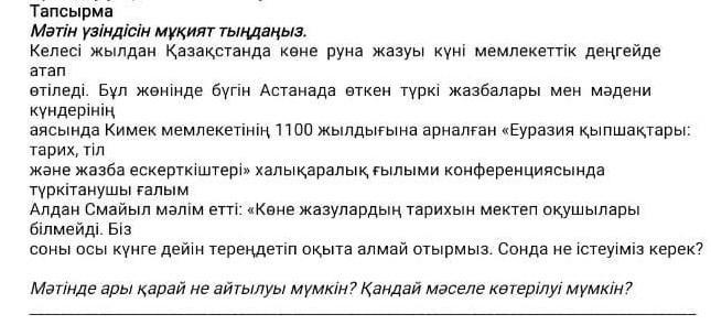 Тапсырма Мәтiн үзiндiсiн мұқият тыңдаңыз . Келесі жылдан Қазақстанда көне руна жазуы күнi мемлекеттік деңгейде атап етiледi . Бұл жөнінде бүгін Астанада өткен түркі жазбалары мен мәдени күндерiнiң аясында Кимек мемлекетiнiң 1100 жылдығына арналған « Еуразия қыпшақтары : тарих , тiл және жазба ескерткіштері » халықаралық ғылыми конференциясында туркітанушы ғалым Алдан Смайыл мәлім етті : « Көне жазулардың тарихын мектеп оқушылары бiлмейдi Бiз соны осы күнге дейін тереңдетіп оқыта алмай отырмыз . Сонда не iстеуiмiз керек ? Мәтiнде ары қарай не айтылуы мүмкін ? Қандай мәселе көтерiлуi мүмкiн ?