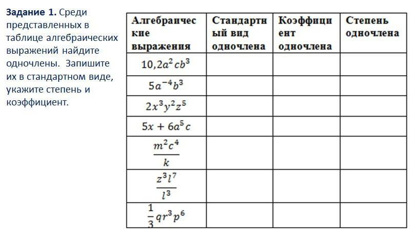 Задание 1. Среди представленных в таблице алгебраических выражений найдите одночлены. Запишите их в стандартном виде, укажите Степень и коэффициент