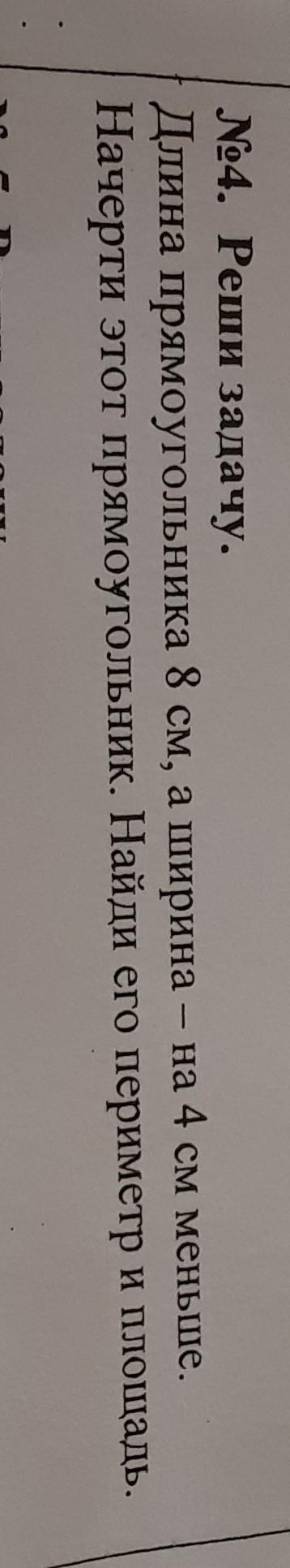 Длина прямоугольника8 см, а ширина на 4 см меньше. Начерти этот прямоугольник. Найди его периметр и площадь.ДАЮ 50 БАЛОВ