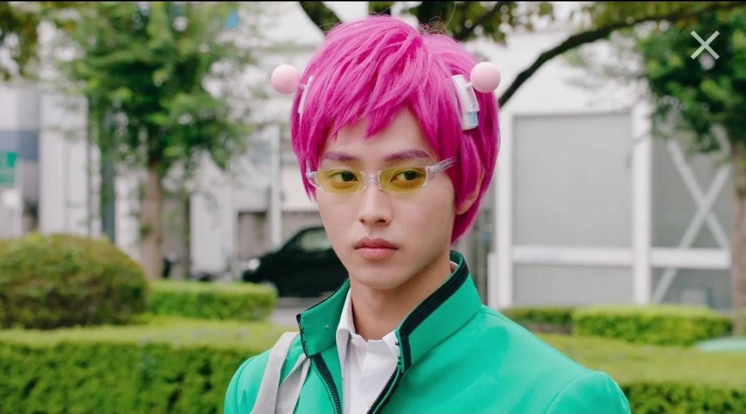 У этого мужчины ярко розовые волосы. Брови у него тоже розовые.Карие или чёрные глаза, его глаза узкие. Не тоненькие губы, но и не сильно пухыле, среднего размера. Вытянутой подбородок. У него есть ободок на голове с розовыми шариками. На нем одета белая рубашка, а по верх берюзовая кофта с чёрными полосками. Так же на нем есть очки с жёлтыми стекляшками.