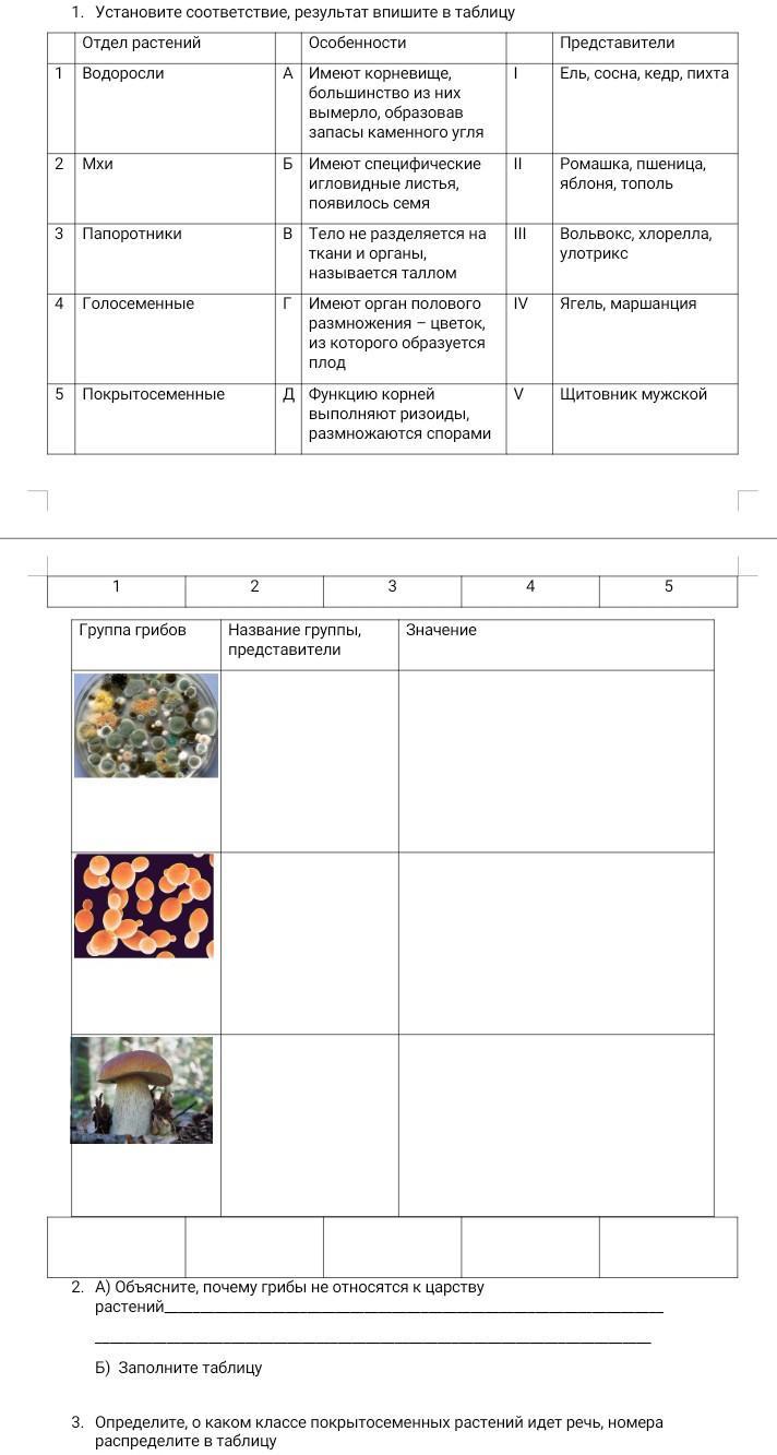 правильный ответ:Водоросли B 3 ; Мхи Б 4 ; Папортники А 5 ; Голосеменные Д 1 ; Покрытосеменные Г 2