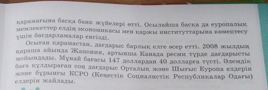 4-тапсырма. Мәтінді оқып, алдыңғы мәтіндермен байланыстырыңдар. Тірек сөздер арқылы ондағы негізгі ойды дәлелдеңдер. 2008 жылы АҚШ-тың тұрғын үй нарығы жеке бағасының 18 пайы. зын жоғалтып, 11,2 триллион долларға тең болды. Нарықтың мұндай дәрежеге жетуі Екінші дүниежүзілік соғыстан кейінгі орын алған алғашқы жағдай еді. 2008 жылдың күзінде америкалық Lehman Brothers банкі қарызға батып, сотқа өздерінің банкрот болғанын және кредит берушілерден қорғау туралы өтініш жіберді. Осыдан соң Merrill Lynch және Morgan Stanley банкрот болғаны туралы жария етті. АҚШ банктерін қолдау мақсатында басқа да еуропалық банктер дағдарысқа тап болды. Ұлыбритания билігі Royal Bank of Scotland (RBC) және Lloyds банктеріндегі акция пакеттерін сатып алды, сол арқылы қаржы институттарын қайта қаржыландырды. Ал 2009 жылы үкімет ПРОДОЛЖЕНИЕ ТЕКСТА НА КАРТИНКЕ