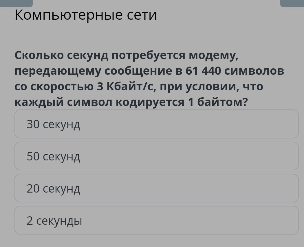 Сколько секунд потребуется модему. передающему сообщение в 61 440 символов со скоростью 3 кбайт/с, при условии, что каждый символ кодируется 1 байтом? 30 50 20 секунд 2 секунды