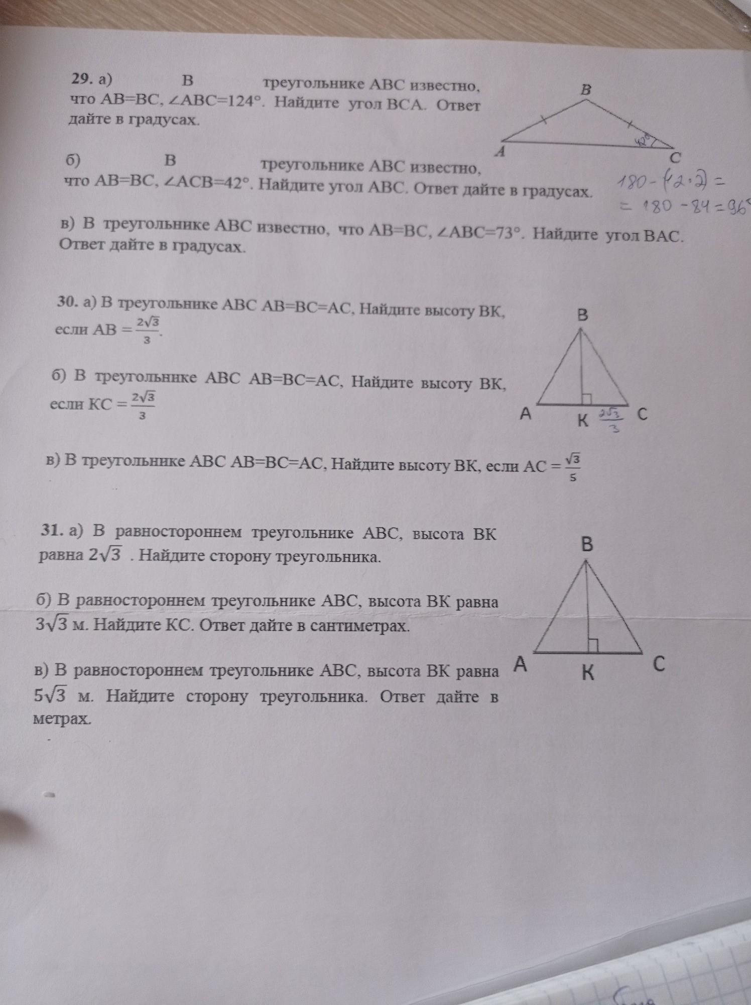 2)угол А= Углу С= 42 градуса( по свойству равнобедренного треуг.), следовательно 180 гр-42-42= 96 гр( по свойству о сумме углов треугольника)