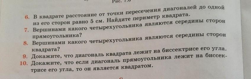 Так как AC и BD - биссектрисы, то угол OBC=углу OCB=45 градусов. Значит угол BOC=180 градусов-угол OBC-угол OCB=180-45-45=90 градусов и диагонали перпендикулярны. Затем выполняется второй признак квадрата: диагонали равны, перпендикулярны и, пересекаясь, делятся пополам. Поэтому ABCD - квадрат. это 10