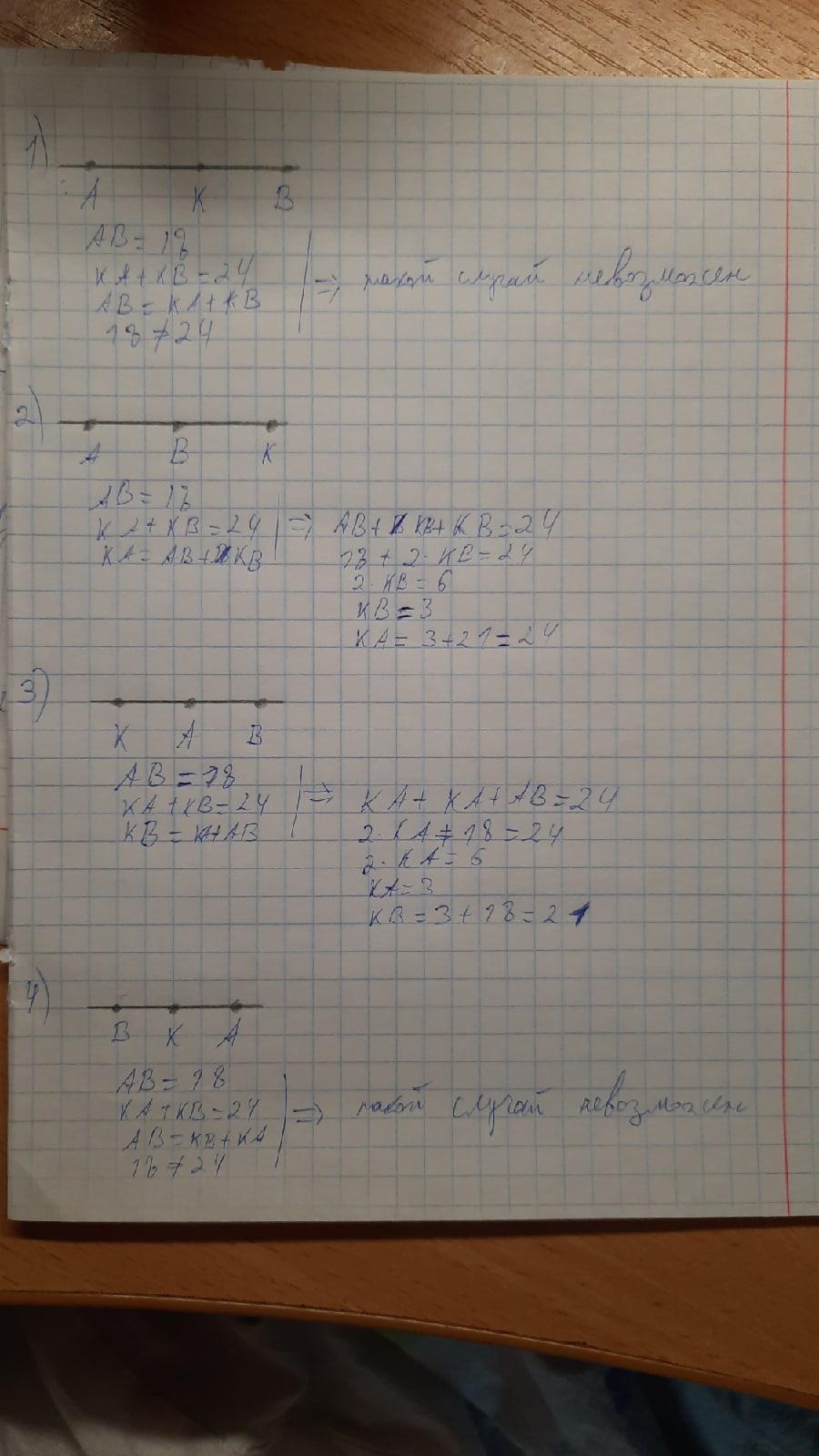 Точки А, В и К принадлежат одной прямой. Вычислите длины отрезков КА и КВ, если АВ = 18 см, а КA + КB = 24 см (необходимо рассмотреть все возможные случаи).