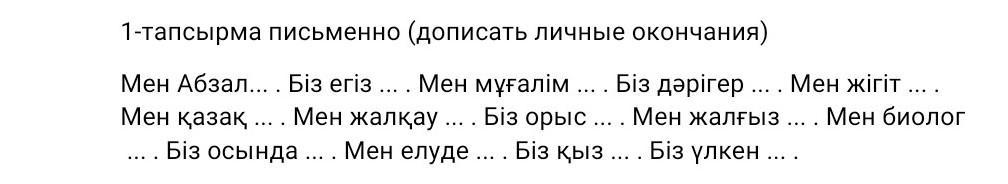 Мен Абзалмын. Біз егізбіз. Мен мұғаліммін. Біз дəрігерміз. Мен жігітпін. Мен қазақпын. Мен жалқаумын.Біз орыспыз. Мен жалғызбын.Мен биологпын. Біз осындай.Мен елудемін. Біз қызбыз. Біз үлкенбіз. Біз жаспыз. Біз баймыз. Мен жұлдызбын. Мен оқытушымын. Біз оқытушымыз. Біз күштіміз. Мен біріншімін. Мен жаманмын.