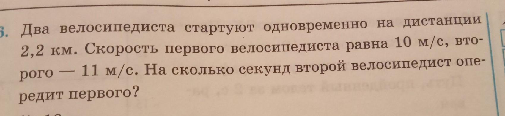 ответ: второй велосипедист опередит первого на 2,2 секунд