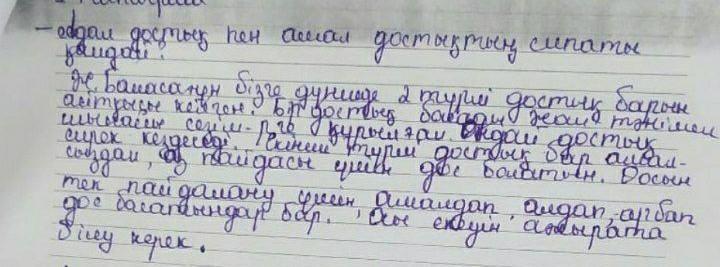 Дос адамдардың мінездері әр түрлі болуы мүмкін, дегенмен құндылықтары мен арман – мақсаттары бірдей болады, бірақ бұл жағдай достыққа еш кедергі бола алмайды. Халқымыз достық қарым – қатынасты ерекше бағалаған, бұған дәлел ретінде бірнеше мақал – мәтел де келтіруге болады. Мысалы, “Дос жылатып, дұшпан күлдіріп айтады”, “Досы жақсының, өзі де жақсы”, “Дүниеде адамның жалғыз қалғаны өлгені, қайғының бәрі соның басында”. Сондықтан, өміріміздегі адал достарымызды бағалап, ортамызға түсініспеушілік түсірмей, ешқашан достарымызды алдамай, керісінше достығымызды нығайта түсейік.