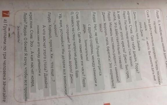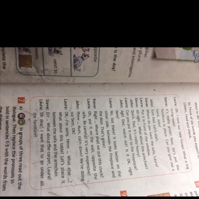 Лаура: О, я люблю наш новый дом. Какой большой зал для игр! мебель на месте, ты можешь мне помочь, Джон? Стив: Это действительно здорово! А теперь давайте поставим Стива: Где ты хочешь диван, Лора? Лаура: Поставь перед окном. Стив: Хорошо ... А как насчет этого кресла? Джон: Быстрее, папа, это действительно тяжело! Лаура: Можешь поставить его рядом с камином? Джон: Ага! Папа, берегись! это нормально, верно Джон: Конечно, папа. Давайте начнем. здесь? Лаура: Нет, не там! Лучше смотрится с другой стороны, между камином и дверью. Замечательно! Стив: Верно ... Куда мы поместим эти часы? Лаура: О, повесь на стену напротив дивана. Будь осторожен! это очень дорого! Джон: Уф ... Мам, успокойся! Мы делаем все возможное, хорошо? Лаура: Окей, прости. Хм Что еще ...? А что насчет этого стола? Поместим его между диваном и креслом. Стив: Эээ ... А как насчет ковра, Лаура? Лаура: О боже! Я хочу, чтобы это было под всей мебелью!