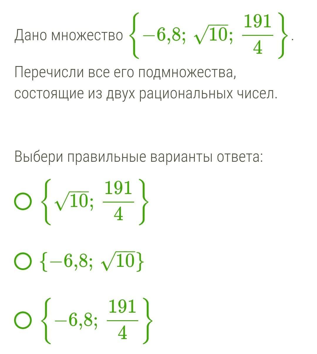 Дано множество {−6,8;10−√;191/4}. Перечисли все его подмножества, состоящие из двух рациональных чисел. Выбери правильные варианты ответа: