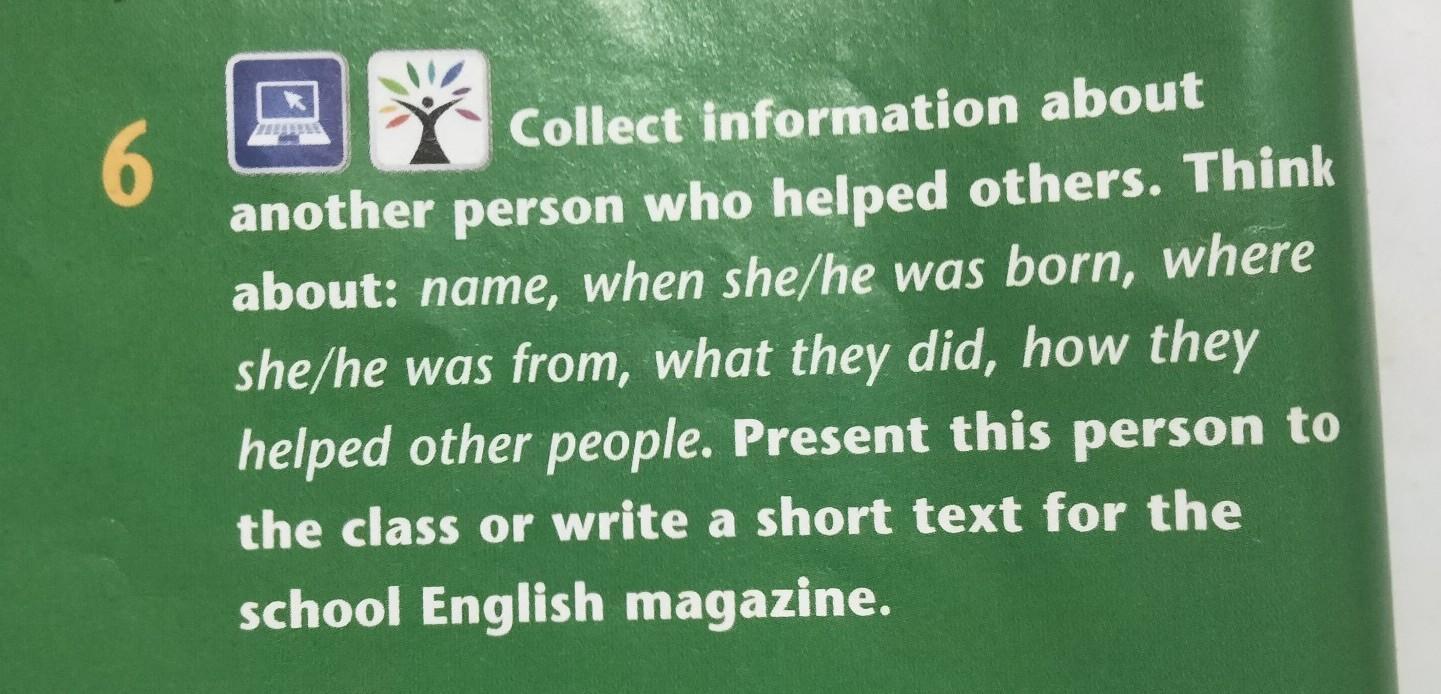 *Collect information about another person who helped others. Think about* : name, when she/he was born, where she/he was from, what they did, now they helped other people. *Present this person to the class or write a short text for the school English magazine* .