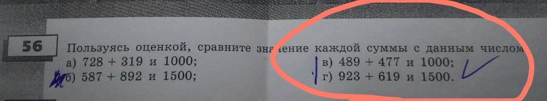 Срочно пж, пользуясь оценкой Сравните значение каждой суммы с данным числом: в) 489+477 и 1000; г) 923+619 и 1500. ДАЮ 10 БАЛЛОВ!