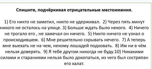 1. Его никто не заметил, никто не удерживал. 2. Через пять минут никого не осталось на улице. 3. Больше ждать было некого. 4. Ничего не трогало его, не замечал он нечего. 4. Никто ничего не узнал о происходившем. 6. Мне решительное скрывать нечего. 7. А теперь мне выехать не на чем, некому лошадей подковать. 8. Им ни в чём нельзя доверять. 9. Я тебе другом никогда не буду. 10. Никакими силами и стараниями нельзя было докопаться, из чего был состряпан его халат.