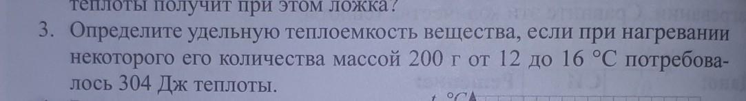 3. Определите удельную теплоемкость вещества, если при нагревании некоторого его количества массой 200 г от 12 до 16 °C потребова- лось 304 Дж теплоты.