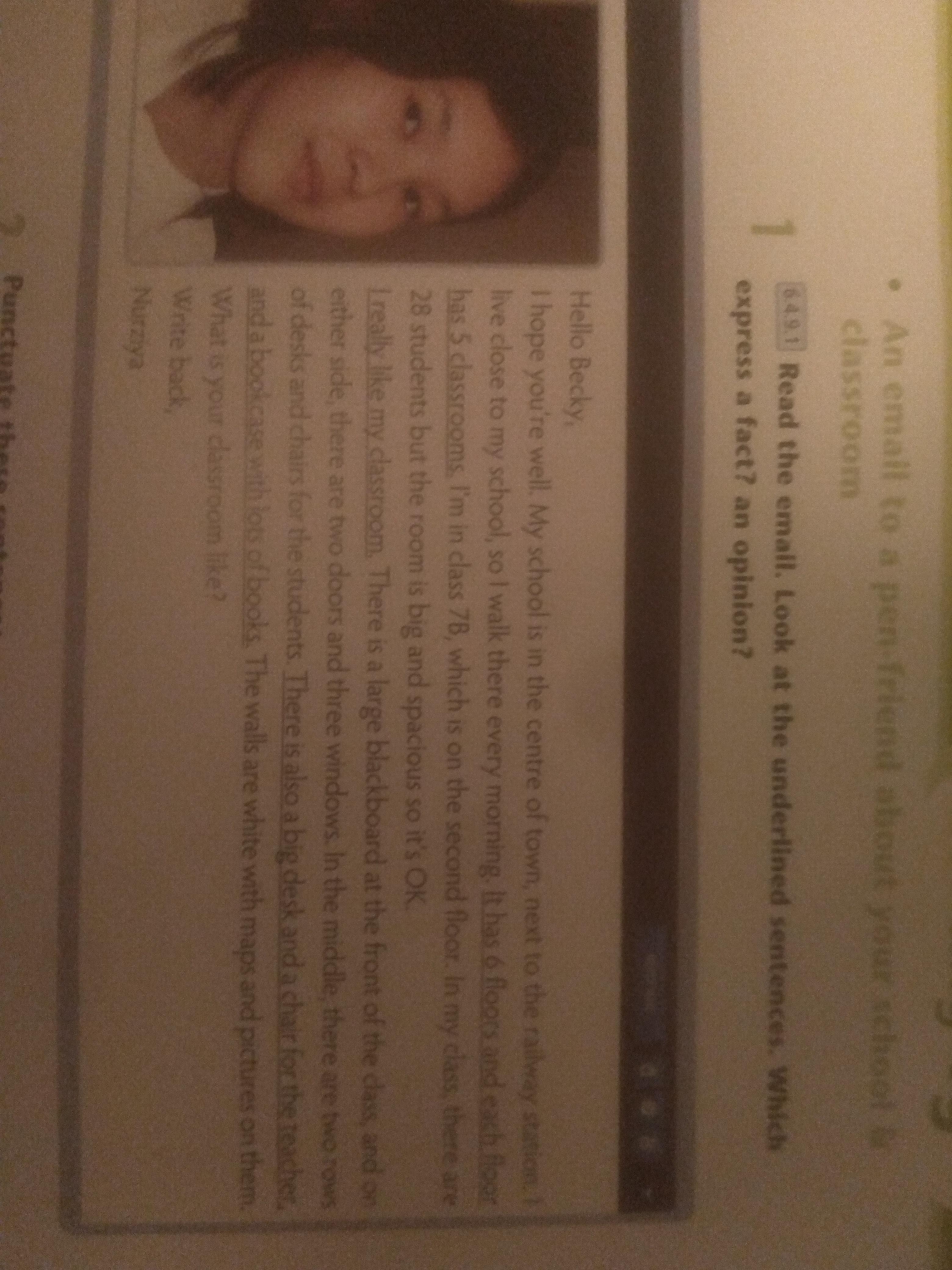 Привет Бекки, Надеюсь у тебя всё хорошо. Моя школа находится в центре города, рядом с железнодорожной станцией. Я живу неподалеку от своей школы и хожу туда к 6:00 утра каждое утро. там 6 этажей и 5 классных комнат на каждом этаже. Я учусь в классе 78 который, находятся на втором этаже. В моём классе 28 учеников но комната большая и Просторная так что всё в порядке. Мне правда нравится Моя классная комната в передней части класса есть большая классная доска. по обеим сторонам 2 двери и три окна по середине, два ряда столов и стульев для учеников. Также Здесь есть большой письменный стол и шкаф для учителя, а также книжная полка с большим количеством книг, стены белые с картами и картинками на них.