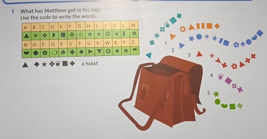 1 What has Matthew got in his bag? Use the code to write the words.
