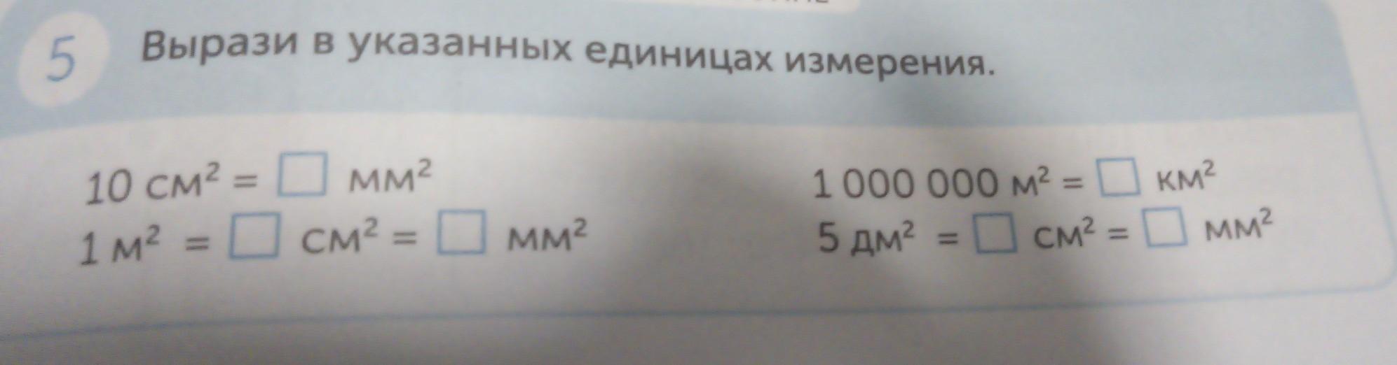 5 Вырази в указанных единицах измерения. 10 см2 = 0 мм2 1 м2 = Осм2 = 0 мм2 1 000 000 м2 = км2 5 дм2 = Осм2 = OMм?