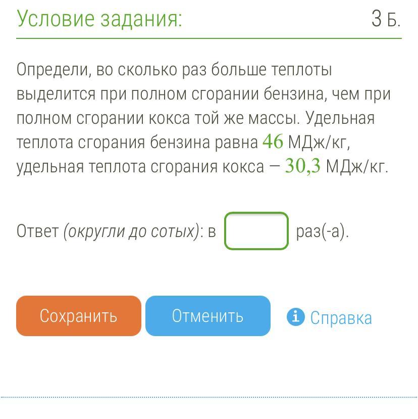 Определи, во сколько раз больше теплоты выделится при полном сгорании бензина, чем при полном сгорании кокса той же массы. Удельная теплота сгорания бензина равна 46 МДж/кг, удельная теплота сгорания кокса — 30,3 МДж/кг.