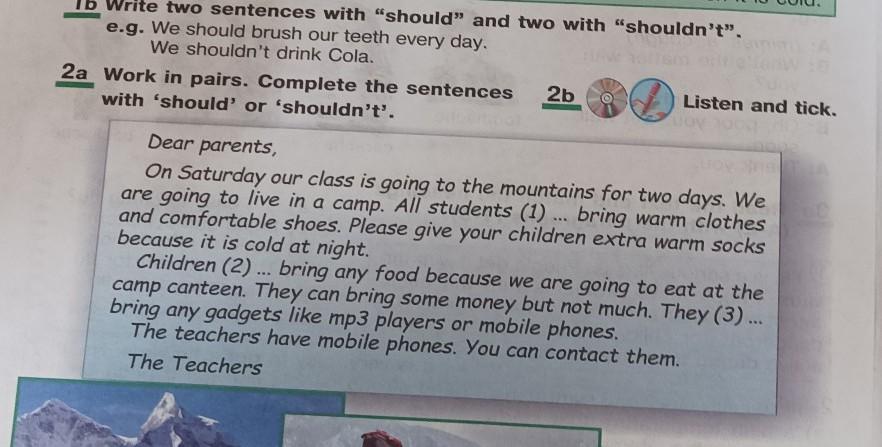 Work in pairs, Complete the sentences with should or shouldn't. Dear parents. On Saturday our class is going to the mountains for two days. We are going to live in a camp. All students (1) ... bring warm clothes and comfortable shoes.Please give your children extra warm socks because it is cold at night. Children (2) ... bring any food because we are going to eat at camp canteen. They can bring some money but not much. They (3)... bring any gadgets like mp3 players or mobile phones. The teachers have mobile phones. You can contact them. The Teachers