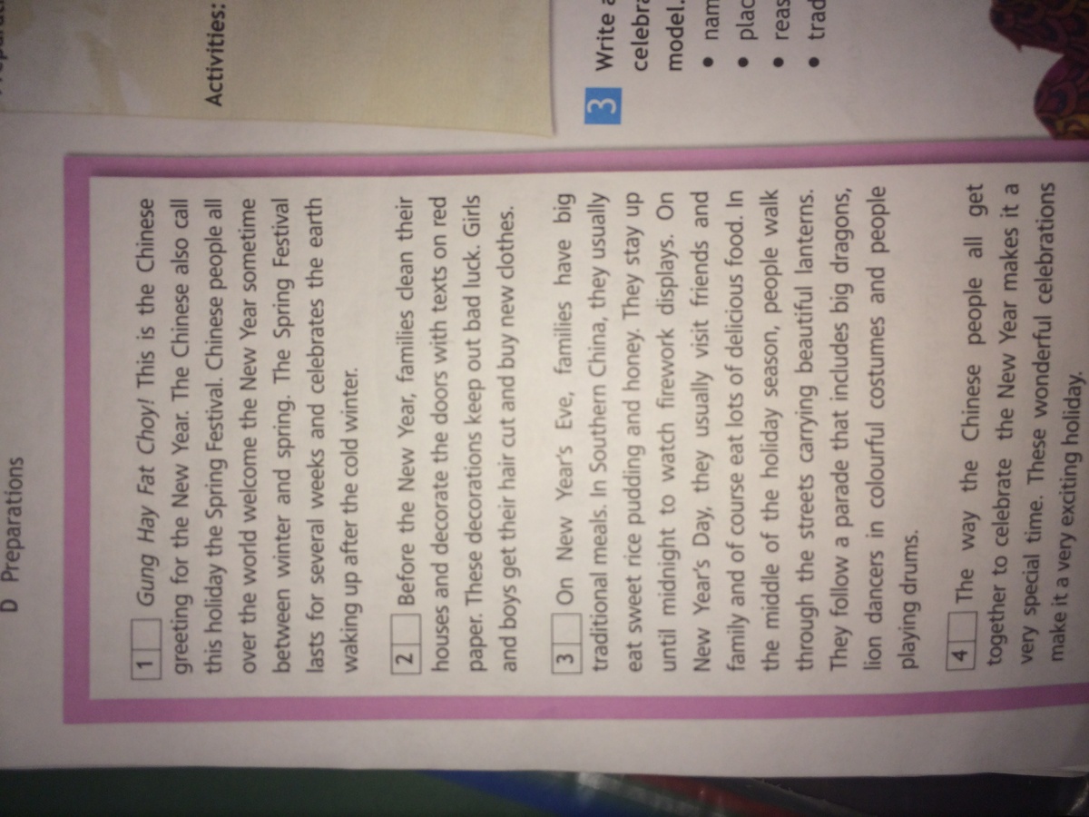 3) На кануне нового года в семьях проходят национальные застолья. На юге Китая обычно едят сладкий рисовый пудинг и мёд. Они не спят до полуночи, чтобы увидеть как запускают салюты. В день нового года они обычно ходят к своим друзьям и родственникам, и, конечно же, едят много вкусной еды. По среди каникул люди ходят по улицам с красивыми фонарями. Они следуют за парадом, который включает в себя больших драконов, "львиных" танцоров в красивых костюмах и людей играющих на барабанах.