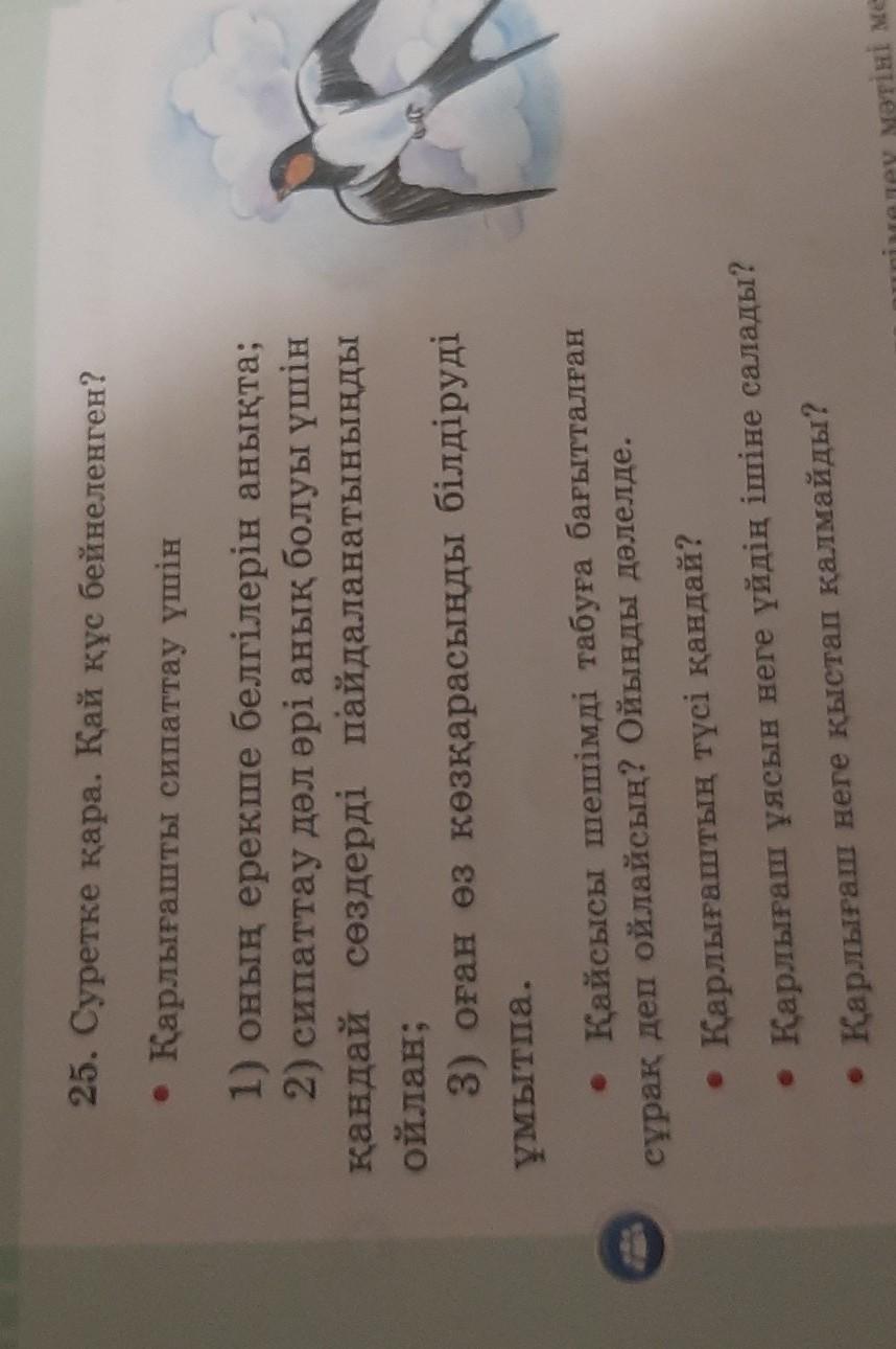 суретте қарлығаш құсы бейнеленген.Қарлығаш құсының құйрығы айыр болады.Ол туралы ертегі аңыздарда бар.Қарлығаштың түсі ала болып келеді өте әдемі құс.Қарлығаш көбінесе ұясын үйдің ішіне салады.Егер салса үйге бақыт береке келеді.Қарлығыш құсы күзде жылы жаққа ұшып кетеді себебі олар суыққа шыдамайды.Сондықтан ұшып кетеді,сосын көктемде келім ұясын салып жүмыртқасын басады.