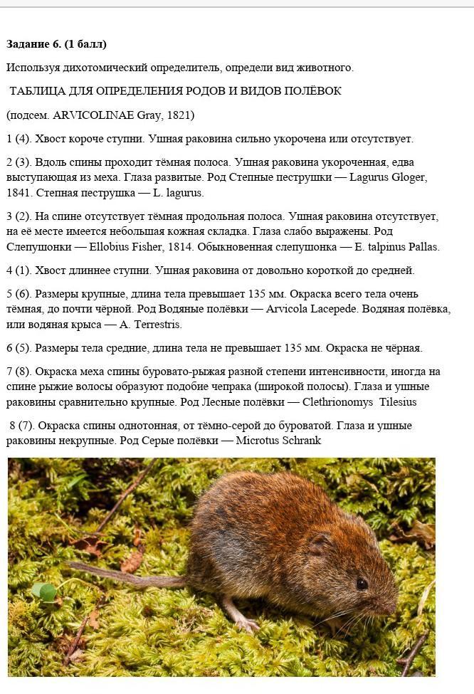 5 (6). Размеры крупные, длина тела превышает 135 мм. Окраска всего тела очень тёмная, до почти чёрной. Род Водяные полёвки — Arvicola Lacepede. Водяная полёвка, или водяная крыса — A. Terrestris.