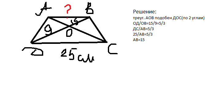рассмотрим треугольники abo и cdo. Они подобны по первому признаку подобия: угол aob равен углу cod (как вертикальные), угол abo равен углу odc, а угол bao равен углу ocd (как накрест лежащие при параллельных прямых ) Так как треугольники подобны, то ab/cd=bo/od=ao/co, ч.т.д.. ab/25=9/15 ab=9*25/15=15 (см) Ответ: ab=15 см.