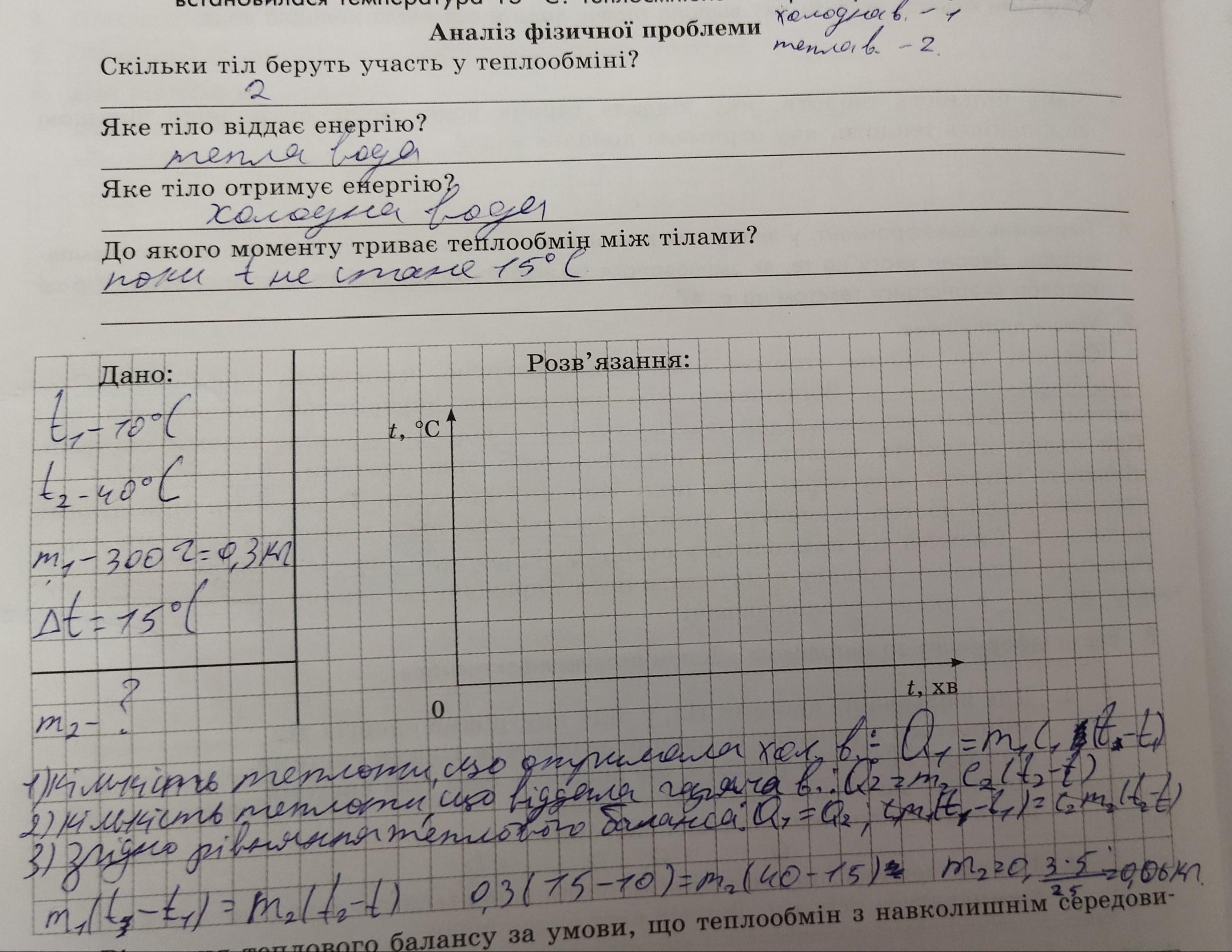 у калометрі змішані 300г холодної води за температури 10С° теплу воду за температури 40С°.Чому дорівнює маса теплової води якщо в калориметрі встановилася температура 15С°?Теплоємністю калориметра знехтували