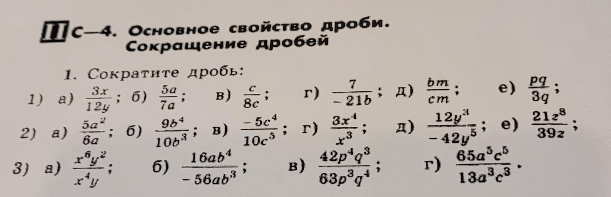 1) а) х/4у б) 5/7 в) 1/8 г) -1/3b д) b/c е) p/3