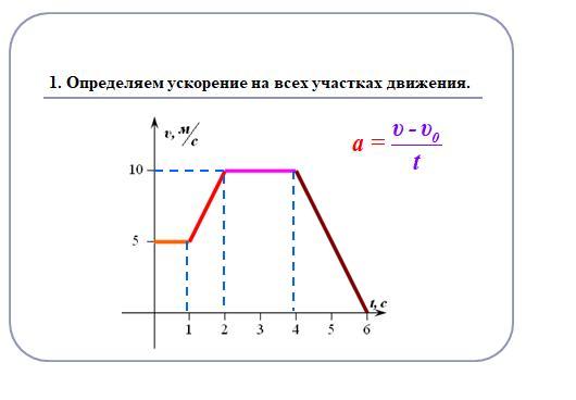 На четвёртом: а_4 = (0 - 10)/(6 - 4) = -5 м/с² - знак минуса показывает, что тело испытывает торможение.