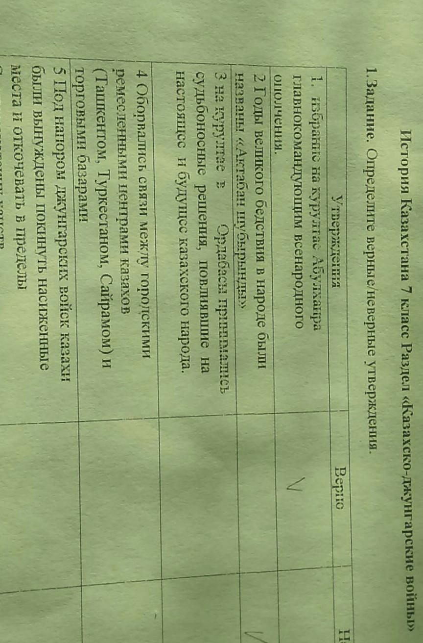 1. Задание. Определите верные/неверные утверждения. Верно y Утверждения 1. браrіс на курулгас Абулхайра главнокомандующим всенародного Ополчения. 2 Годы великого бедствия в народе были названы «Ақтабан плубырынды» 3 на курултае в Ордабасы