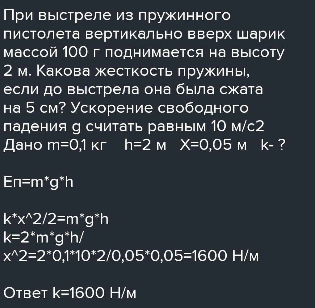 при выстреле из пружинного пистолета вертикально вверх пуля массой 2г поднялась на высоту 10 м. если сопративлением воздуха пренебречь то пружина жесткостью 1000 Н/м была сжата на (g~10 м/с2)