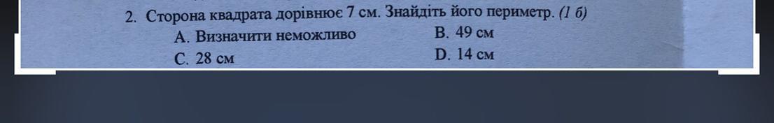 Квадрат имеет 4 стороны, все они равны. Р=4а, где а --- сторона квадрата. Р=4а=4*7=28 (см). Ответ: С. 28 см.