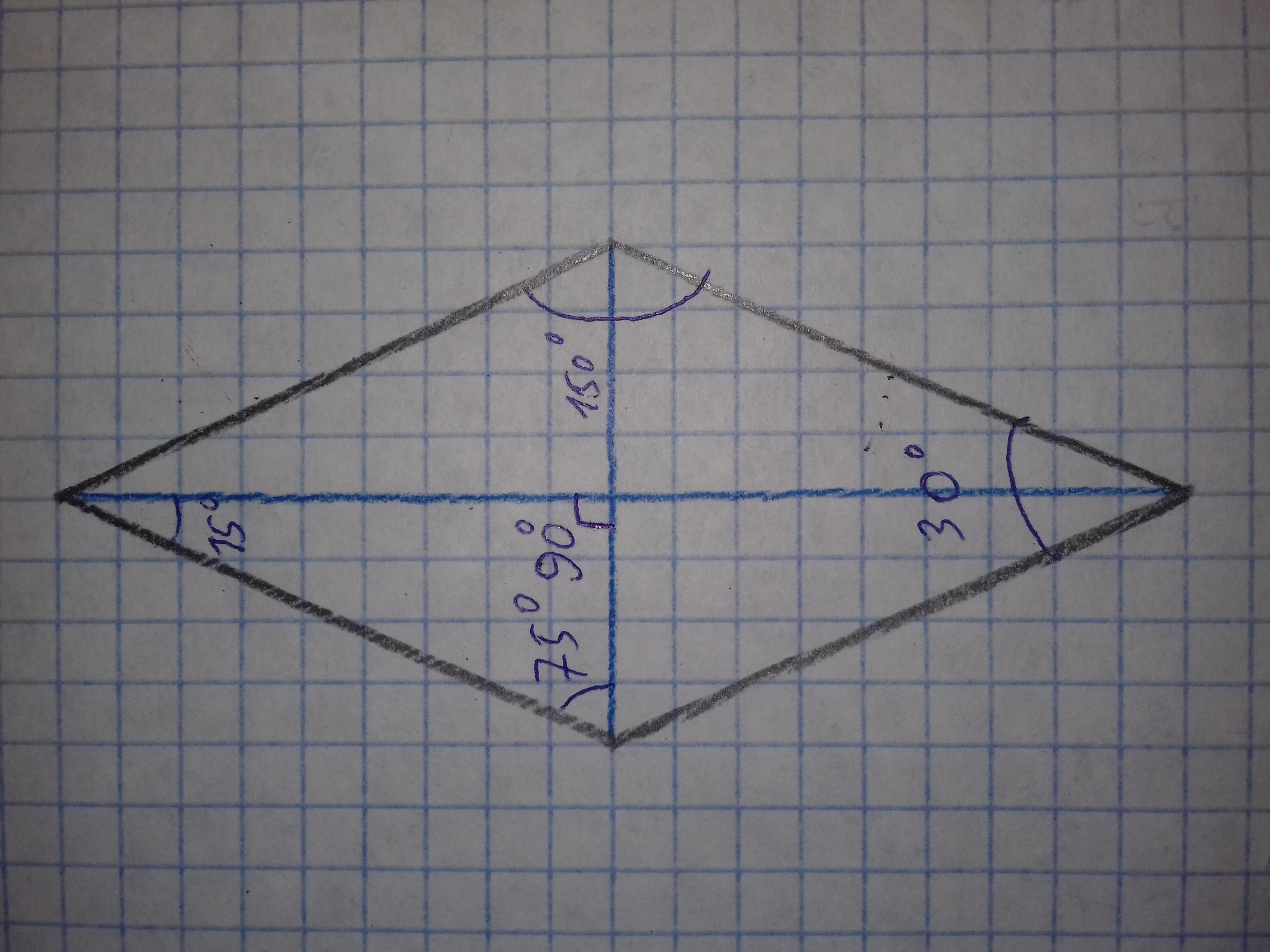 Діагоналі ромба перетинаються під прямими кутами. В результаті утворюються чотири однокові прямокутні трикутники. Сумма кутів трикутника дорівнює 180°. Один з трьох кутів - прямий - 90°. Сумма двох інших дорівнює 90°. Ці кути відносяться одид до одного як 1:5. Тобто меньший кут дорівнює 90 / 6 = 15°, а більший кут дорівнює 15 × 5 = 75°. Перевіримо 75 / 15 = 5.