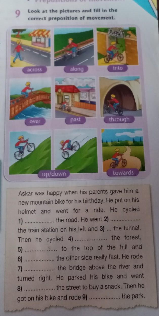 Askar was happy when his parents gave him anew mountain bike for his birthday. He put on his helmet and went for a ride. He cycled 1) ALONG the road. He went 2) PAST the train station on his left and 3) THROUGH the tunnel.