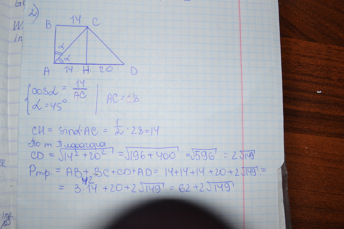 как вычислить периметр прямоугольной трапеции, если основы 14 и 34 см а меньшая диагональ является бисектрисой прямого угла