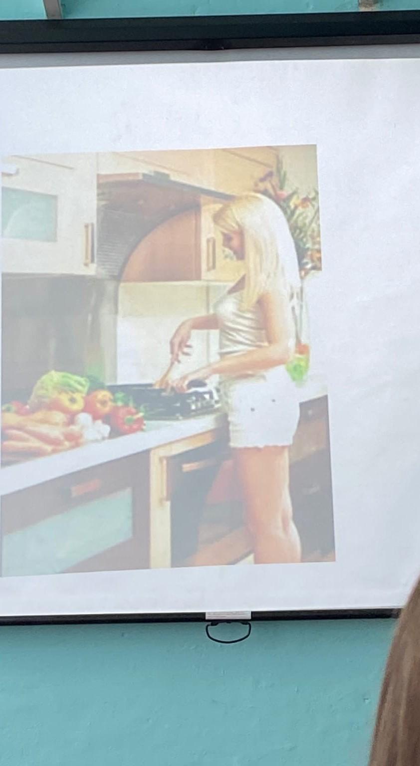 In the picture, the girl is preparing lunch or dinner. There are a lot of vegetables on her table, which means the food will be healthy and wholesome. The interior of the kitchen looks good, the colors match well. There is a houseplant in the back. The girl is well dressed. I think in the picture it is summer or late spring, because the sun is shining brightly and the girl is lightly dressed