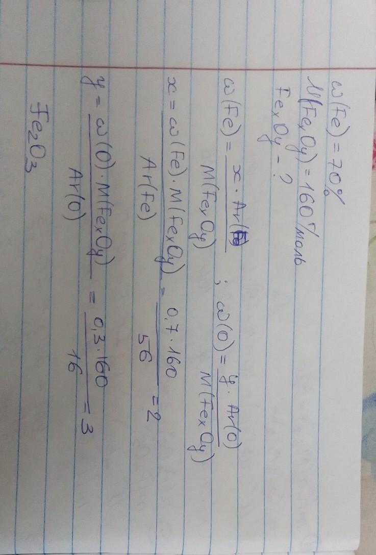 Выведите химическую формулу соединения, если известно, что массовая доля железа составляет 70%, а остальное – кислород. Масса молекулы равна 160 а.е.м.