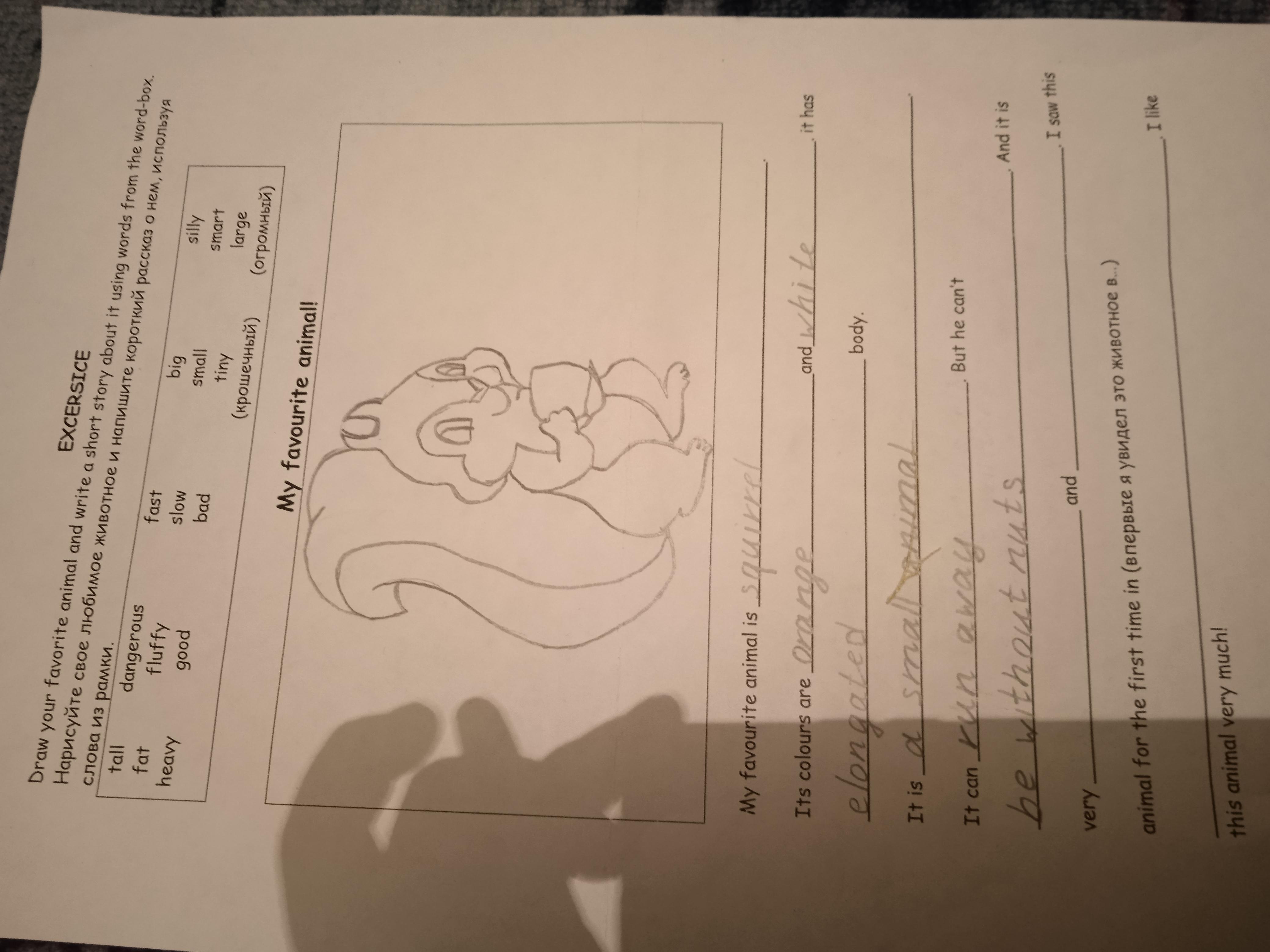 my favorite animal is the squirrel. Its color is orange and white. It has a soft body. it is a small animal. can escape. but cannot be without nuts. And he runs very fast and is a beautiful animal. I saw this animal for the first time at the zoo and I liked it. i like this animal very much