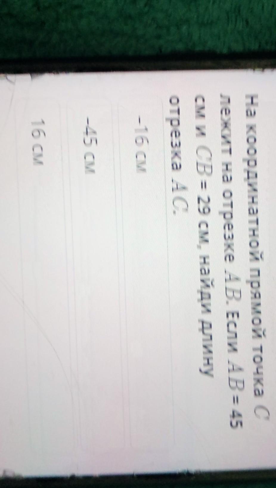 На координатной прямой точка С лежит на отрезке AB. Если AB = 45 см и CB = 29 см, найди длину отрезка АС. -16 см -45 см