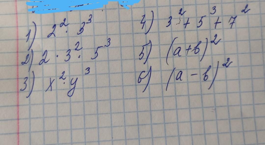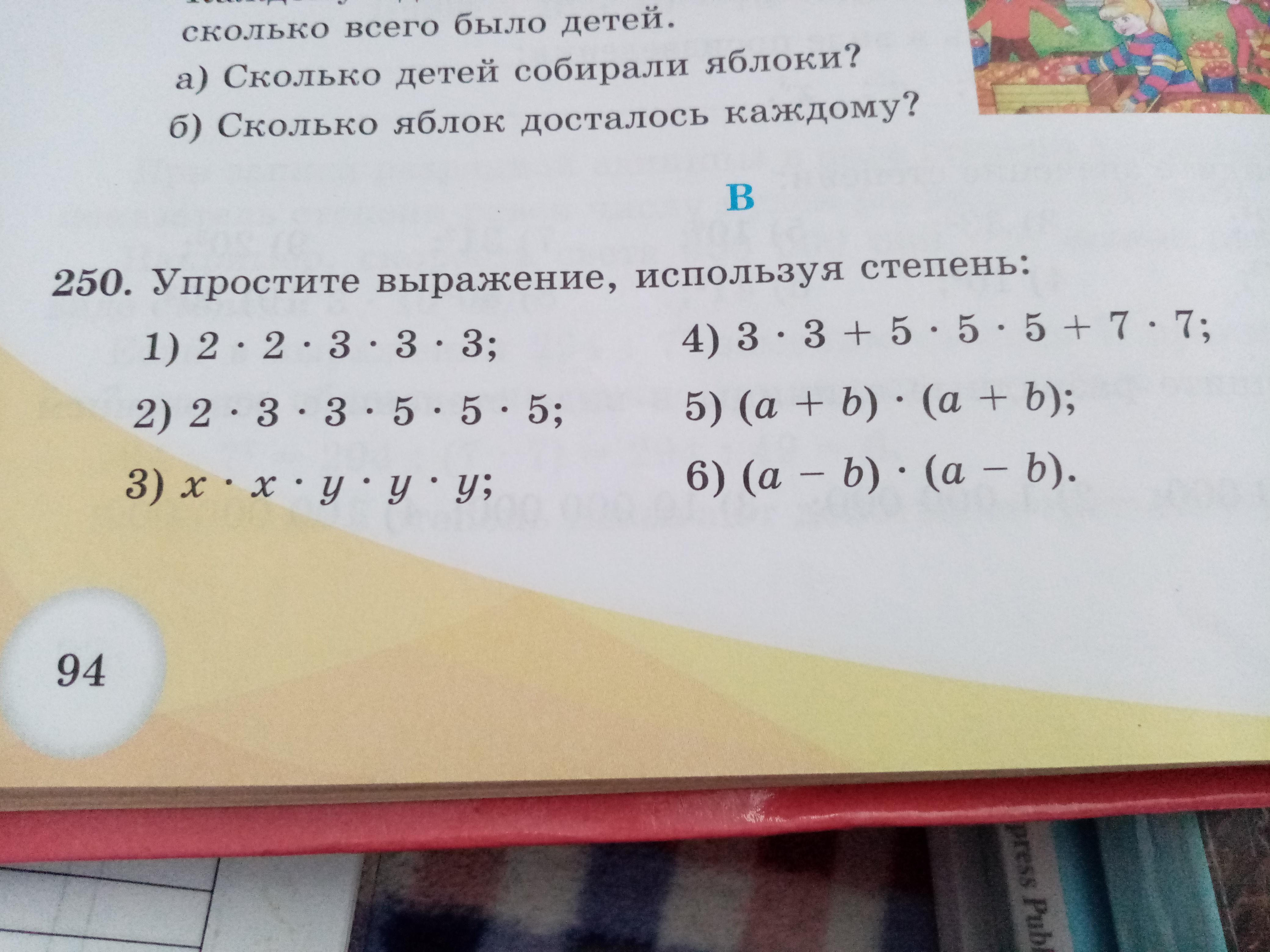 250. Упростите выражение, используя степень: 1) 2 · 2 · 3 · 3 · 3; 4) 3 · 3 + 5 · 5 · 5 + 7 . 7; 2) 2 · 3 · 3 ·5· 5 · 5; 5) (a + b) : (a + b); 3) x-x-у-у-у; 6) (a – b) : (a – b).
