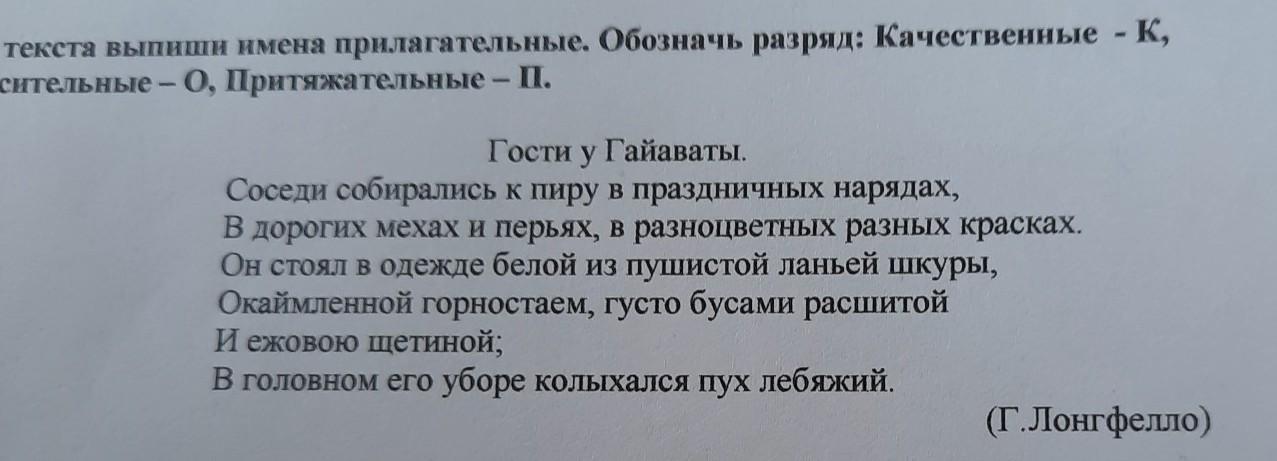 4. Из текста выпиши имена прилагательные. Обозначь разряд: Качественные -К, Относительные — О, Притяжательные – П. Гости у Гайаваты. Соседи собирались к пиру в праздничных нарядах, В дорогих мехах и перьях, в разноцветных разных красках. Он стоял в одежде белой из пушистой ланьей шкуры, Окаймленной горностаем, густо бусами расшитой И ежовою щетиной; В головном его уборе колыхался пух лебяжий. (Г.Лонгфелло