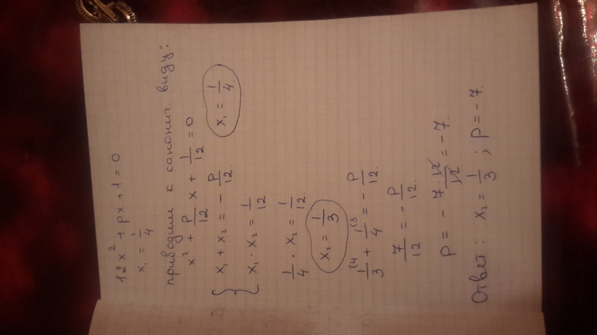 Уравнение 12x^(2)+px+1=0 имеет одним из корней число 1/4. Найдите другой корень и второй коэффициент