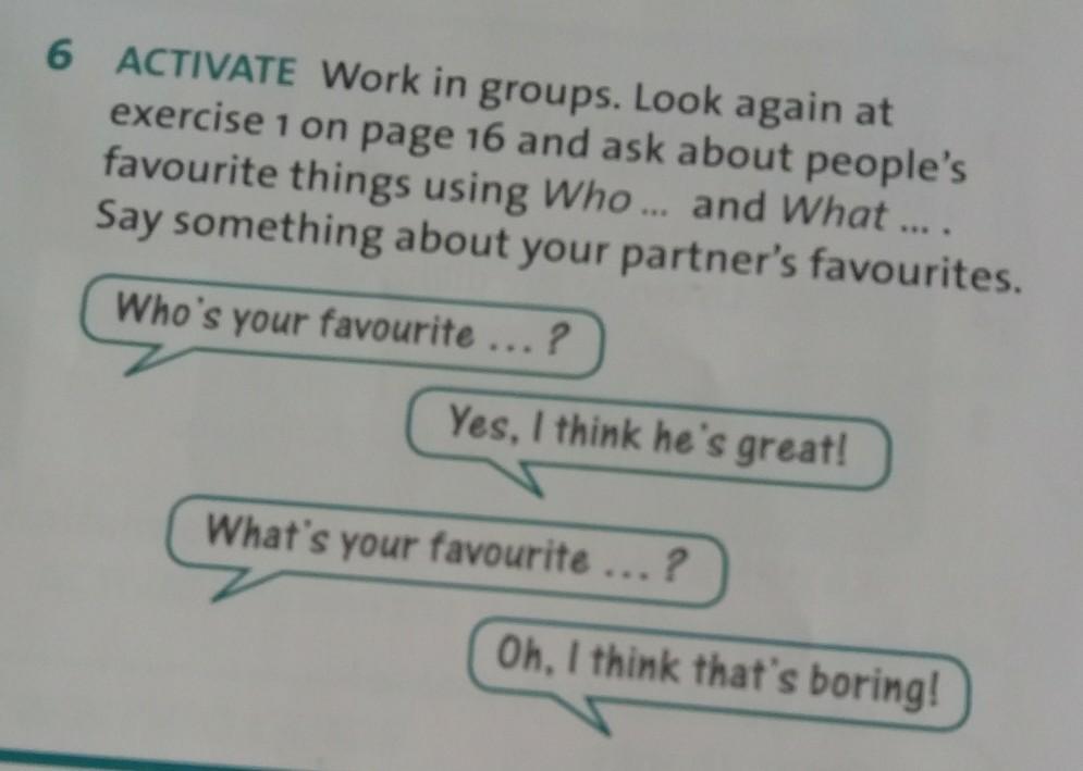 Ответ:6) активировать работу в группах. еще раз просмотрите упражнение 1 на стр. 16 и спросите о любимых вещах людей, используя, кто .. и что .. сказать что-нибудь о любимых вещах вашего партнера. кто твой любимый да, я думаю, он великолепен! какой твой любимый о, я думаю, это скучно! )